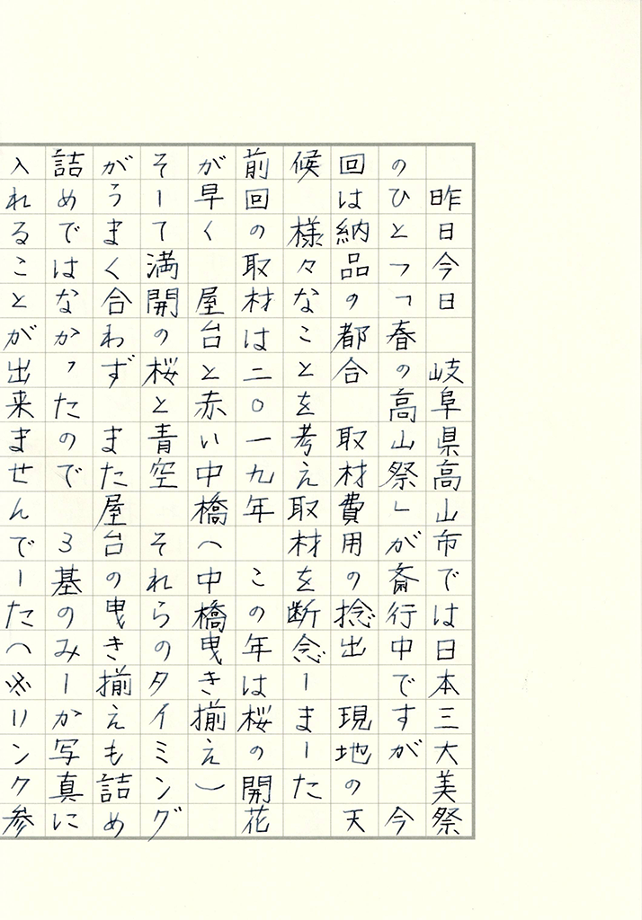 日々のこと 2026.04.15 春の高山祭と赤のインク 記事のタイトルとURLをコピーする岐阜県 春の高山祭 中橋と屋台 | 奥田健一フォトアーカイブ Post Share LINE note MONT BLANC インク インク色 インポート ウェブサイト タイミング ブルーブラック モンブラン 万年筆 中橋 公文書 公文書用 写真 取材 取材費用 屋台 撮影 文具 日本三大美祭 春の高山祭 曳き揃え 桜 橋 筆記具 赤 赤い橋 赤色 開花 青 青色 高山祭 黒 黒色 10月の問題 前の記事
