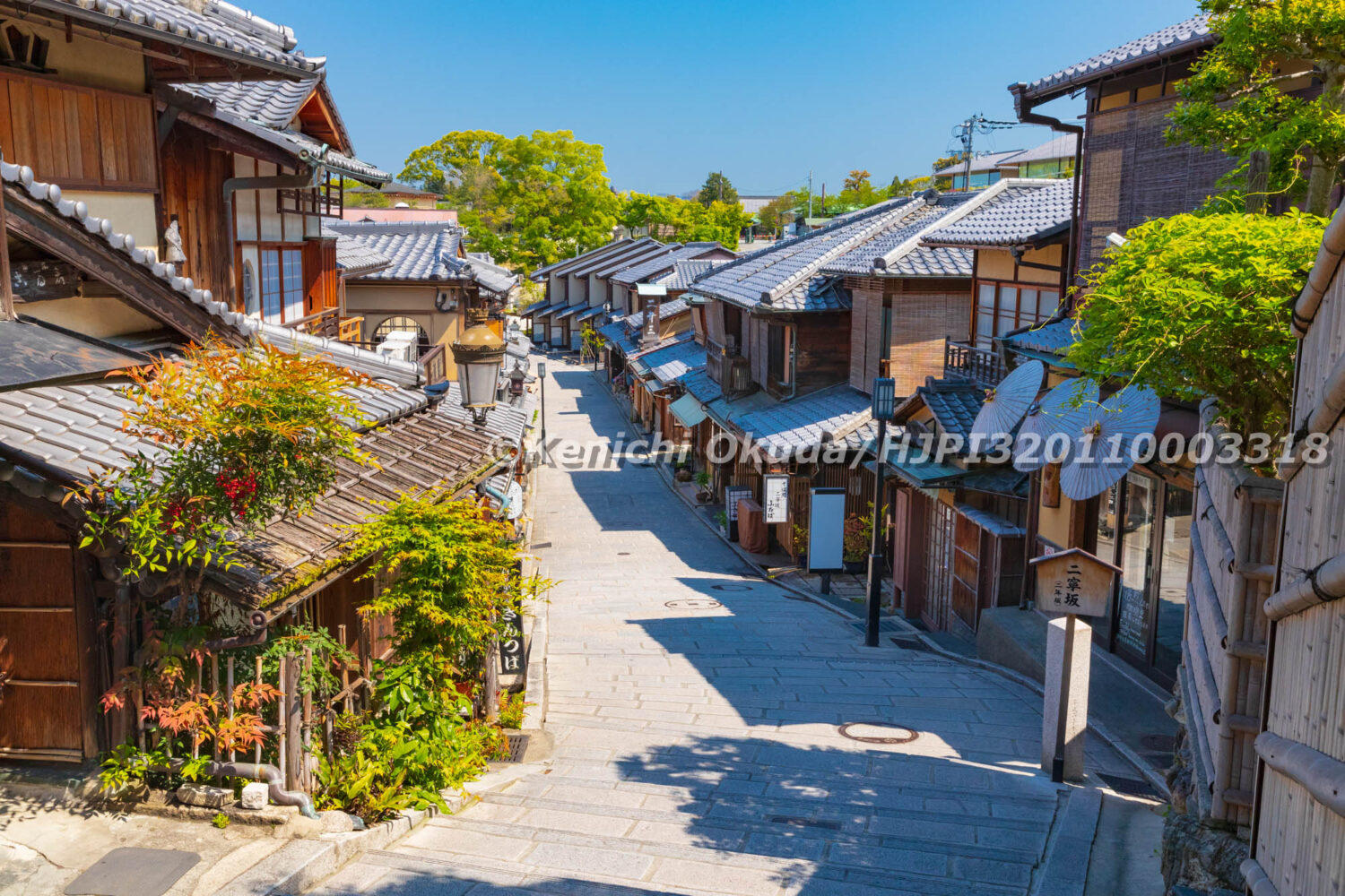 二寧坂, 二年坂, 京都市, 京都府, 名所, 国の重要伝統的建造物群保存地区, 国選定重要伝統的建造物群保存地区, 国重要伝統的建造物群保存地区, 坂, 坂道, 日本, 春, 昼, 晴れ, 東山区, 町, 町並み, 石段, 石畳, 石階段, 街, 街並み, 道, 重要伝統的建造物群保存地区, 階段, 青空