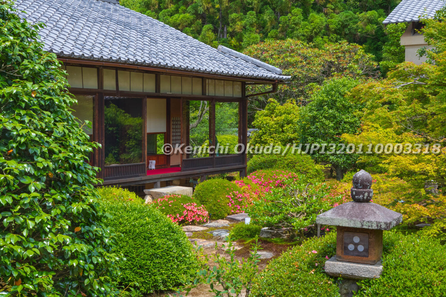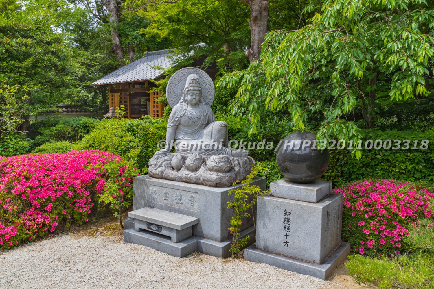 サツキ, 京都市, 京都府, 仏, 仏像, 像, 塔頭, 夏, 大輪の間, 寺, 庭, 庭園, 御寺, 悟りの間, 新緑, 日本, 日本庭園, 昼, 晴れ, 曇り, 書院, 東山区, 泉涌寺, 泉涌寺山内町, 灯ろう, 灯籠, 燈籠, 皇室, 皇室香華院, 皐月, 石像, 縁側, 花, 菩提寺, 蓮華の間, 衆宝観音, 観音菩薩, 障子, 雪見障子, 雲龍院