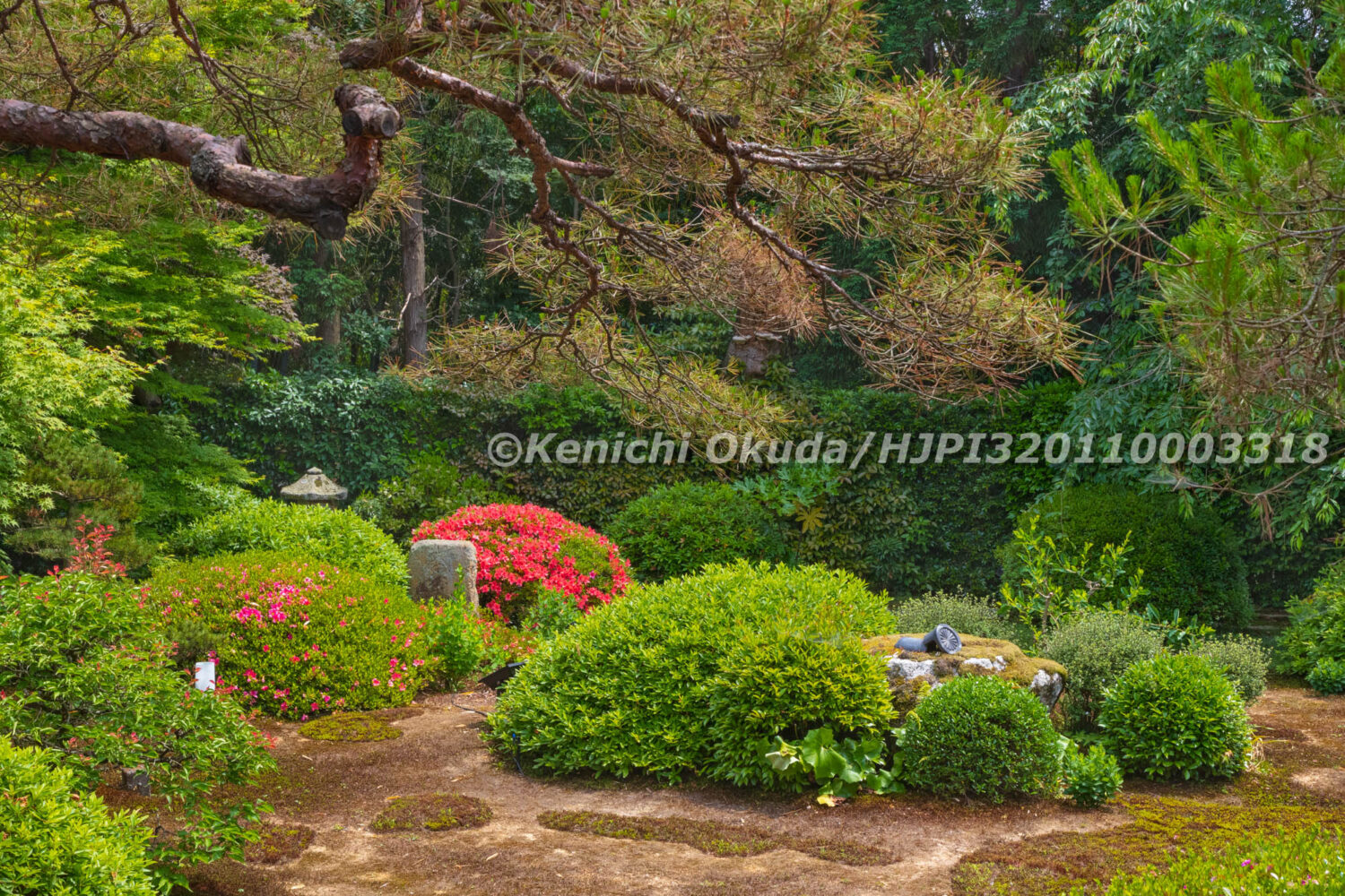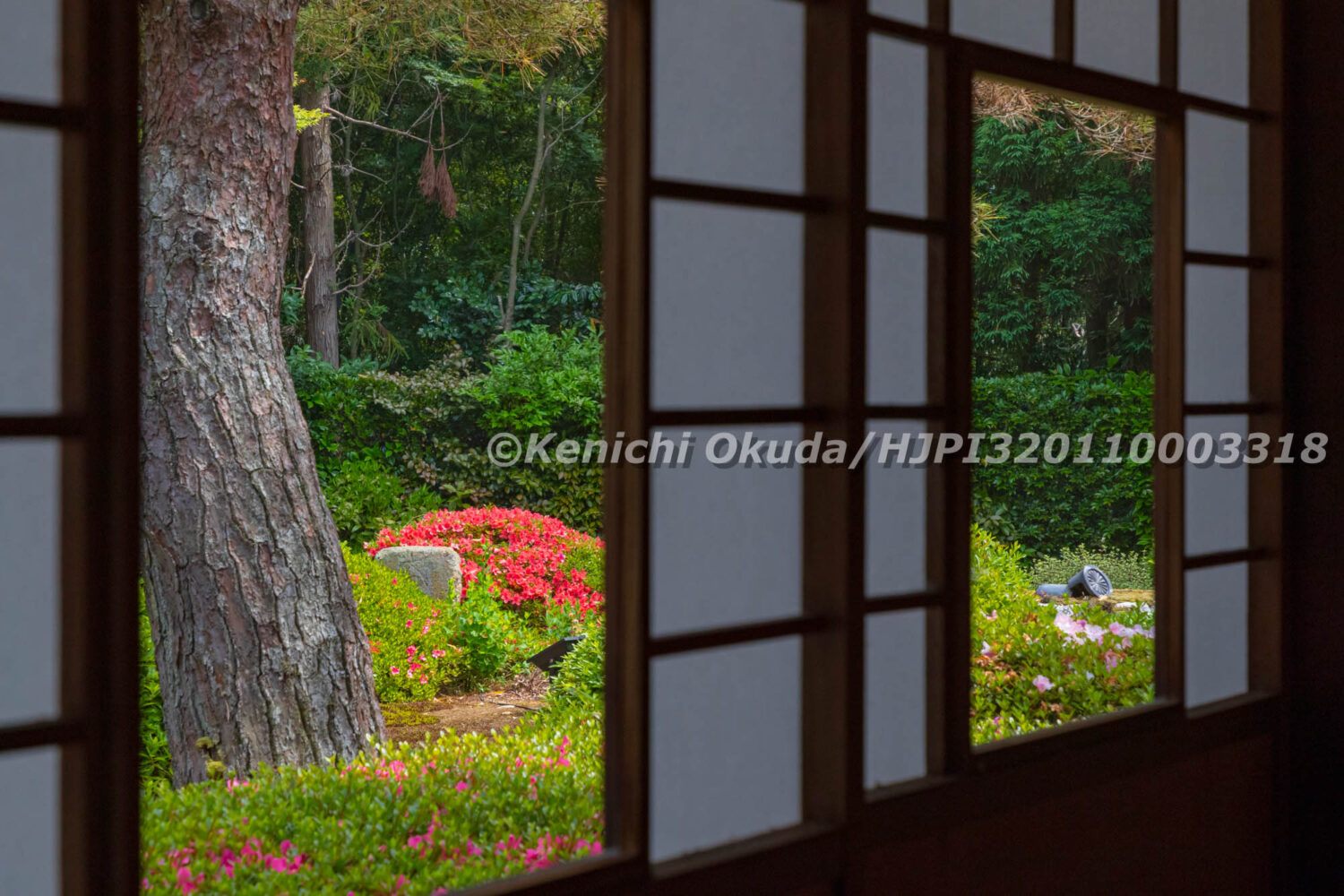 027_596 泉涌寺 雲龍院 サツキ咲く庭園 大輪の間から望む